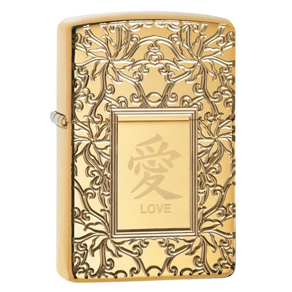 The Chinese symbol of love is engraved on the face of this lighter A floral pattern covers the base of the Armor® High Polish Brass. Comes packaged in a gift box. For optimum performance, fill with Zippo lighter fuel.